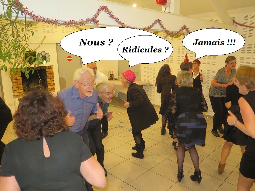 | Mais oui, la soirée de Nouvel An se termine déjà ! Ces quelques heures ont passé vraiment trop vite, mais ne nous attendrissons pas une nouvelle année commence avec plein de projets pour notre petit groupe et nos amis :-). Pour commencer la galette des rois puis des bals, des stages, des festivals et la joie de retrouver nos connaissances, et des démos aussi bien sûr plein de démos. Super, vive 2020 !!! Merci à tous et BONNE ANNEE. |