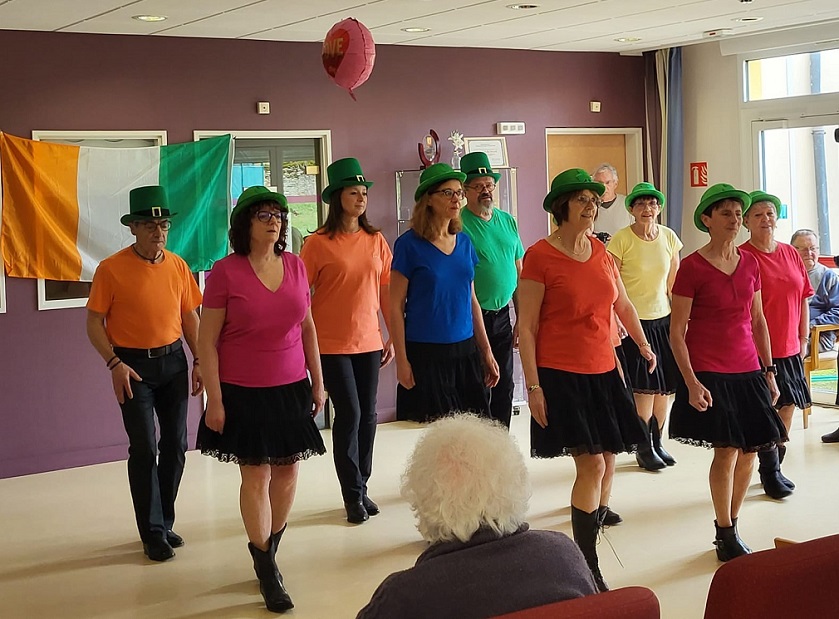 | Ce 15 mars, c'est dans la joie et la bonne humeur que nous avons présenté quelques danses irlandaises à la résidence La Source Du Breuil à Ste Marie Aux Chênes. La St Patrick approche !!! Heureusement pour nous, contrairement au drapeau que l'on voit sur cette photo, nos têtes n'étaient pas à l'envers et nous avons pu effectuer une belle prestation bien applaudie par les spectateurs.