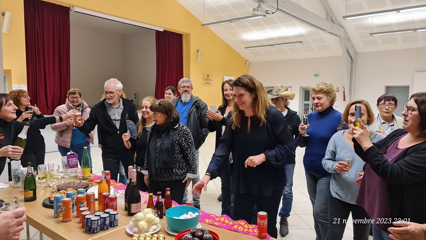 | Après avoir bien dansé nous voici tous réunis autour d'une belle table bien accueillante pour fêter dignement les natives de novembre. JOYEUX ANNIVERSAIRES A CHRISTINE, NATHALIE ET VERONIQUE !!!!!! Merci et bravo Mesdames les patissières et organisatrices tout était succulent.