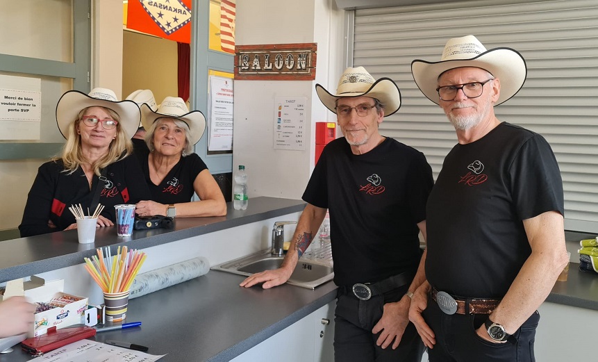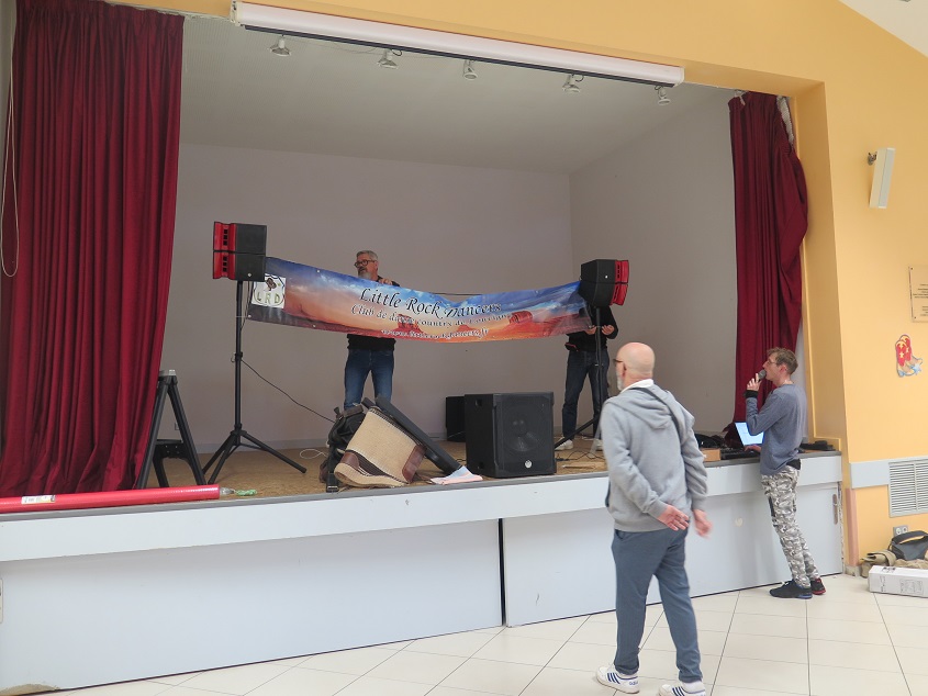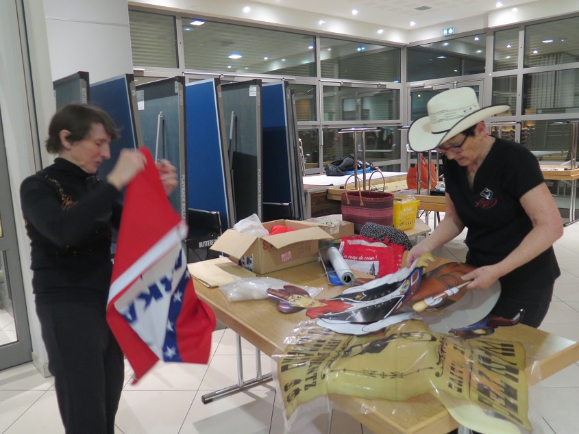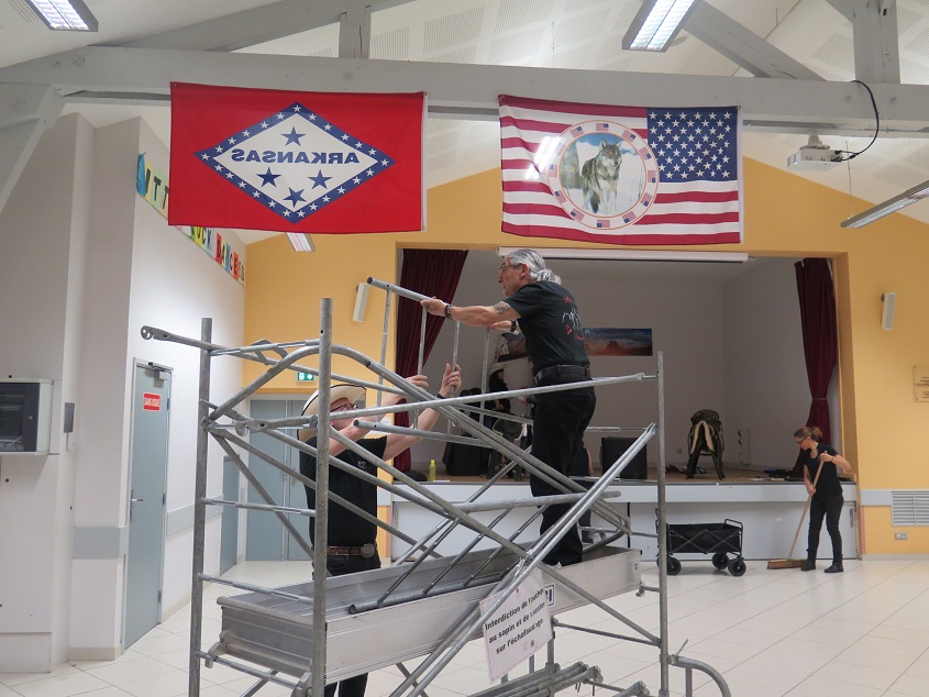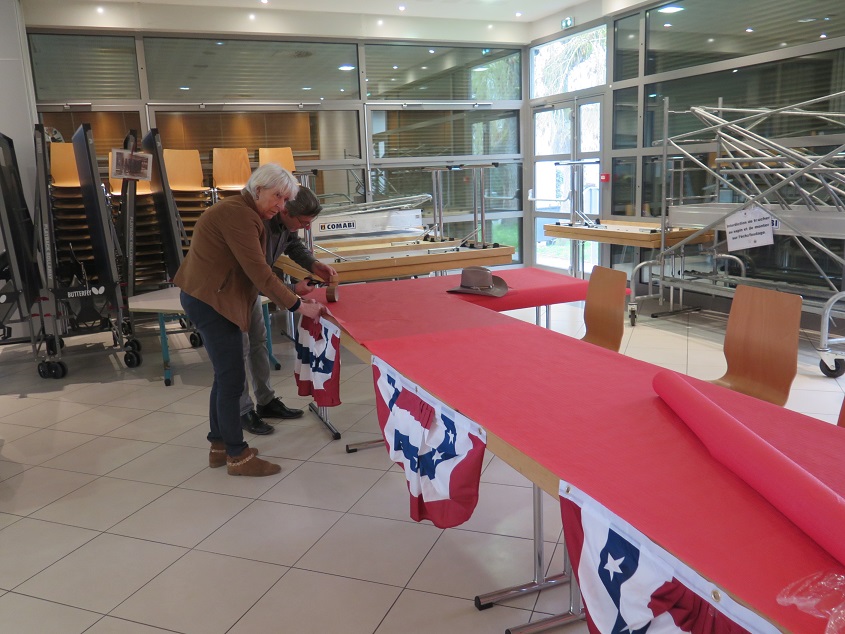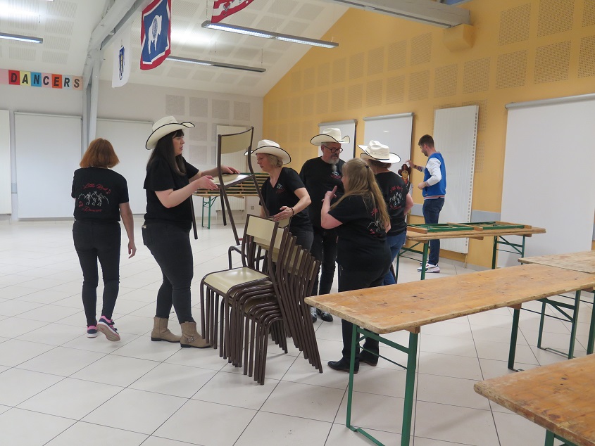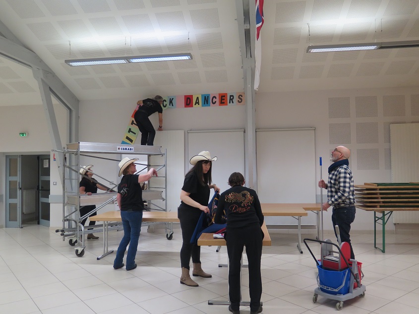 | Organiser un bal country ça se prépare. Bien avant avec l'élaboration des flyers et tracs, des playlist et plannings, et puis la veille pour transformer une salle des fêtes banale en salle style Ouest américain pour accueillir au mieux les passionnés des clubs voisins. Peu à peu la salle se transforme ..... |